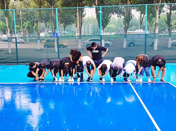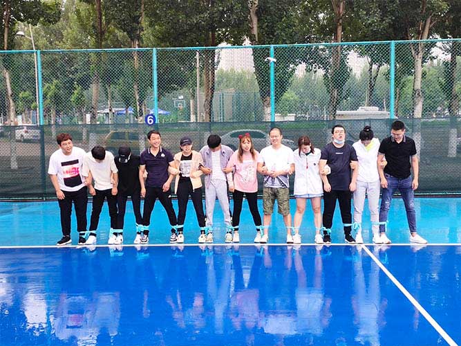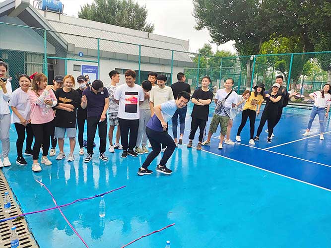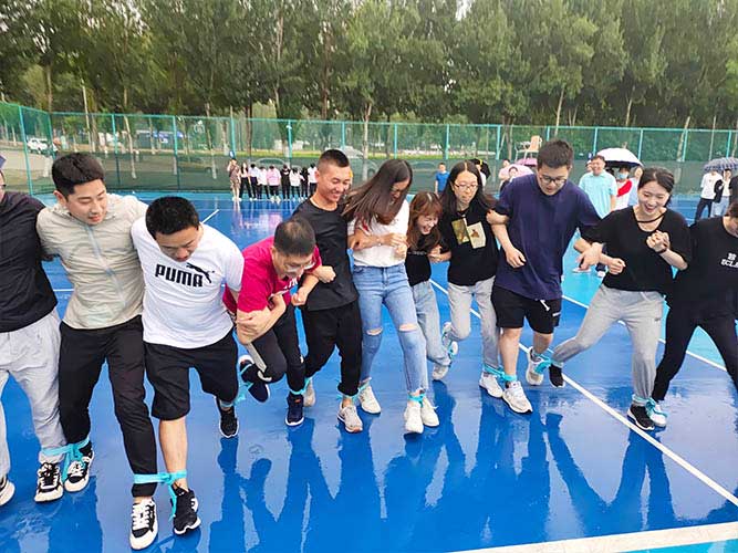 大家一排站好,從左到右,每人的右腿與另一人的左腿依次并齊,并用扁帶繩子系上,繩子綁的位置是腳踝以上部分。聽見哨聲即為游戲開始,從起點到終點,按用時由短到長,取前五名依次加分。